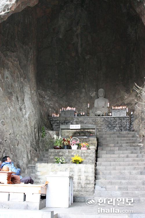 산방굴사. 천장에서 물이 떨어져 내린다.