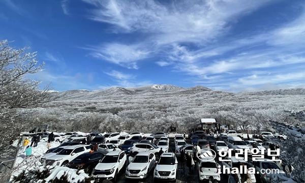 영실 매표소 입구에 설경 감상을 위해 몰려든 차량. 한라일보DB