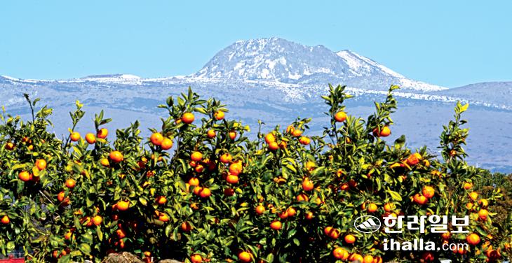노랗게 익은 감귤과 눈 쌓인 한라산의 대조. 한라일보DB