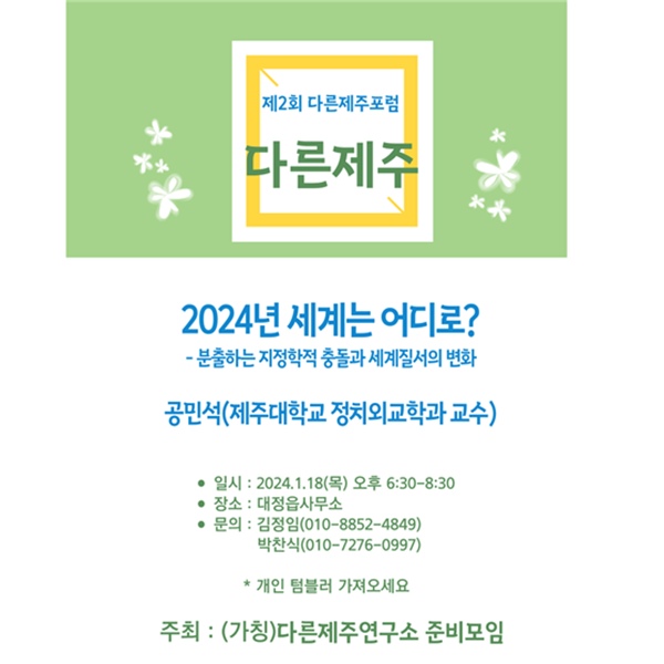 오는 18일 서귀포시 대정읍사무소에서 열리는 이번 포럼은 '2024년 세계는 어디로? - 분출하는 지정학적 충돌과 세계질서의 변화'를 주제로 제주대 정치외교학과 공민석 교수가 발제한 후 토론을 진행한다.