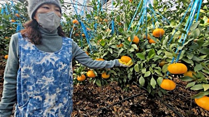 서귀포시 남원읍 레드향 하우스에서 재배농가가 셀레늄을 이용해 재배하고 있는 것에 대해 소개하고 있다.