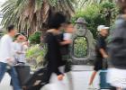 23일 제주시 제주목관아를 찾은 중국인 관광객들이 한복을 입고 눈 내리는 풍경을 배경으로 사진을 찍고 있다. 강희만기자