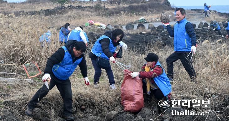 지난 27일 제주시 조천읍 조천리 해안가에서 제주관광대사회복지과 로타렉트 회원들이 해양쓰레기 수거 자원봉사활동을 하고 있다. 강희만기자