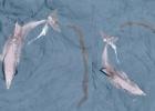 29일 서귀포시 대정읍 해상에서 유영하고 있는 종달이. 처음 발견됐을 때 모습과 달리 현재는 꼬리 쪽에 길다랗게 달려 있던 폐어구 일부와 부유물 대다수가 사라졌다. 그러나 나머지 폐어구는 여전히 입 쪽에 걸려 있는 동시에, 꼬리 쪽을 동동 휘감고 있어 완전히 제거하는 데 시일이 걸릴 것으로 예상된다. 다큐제주 오승목 감독 제공