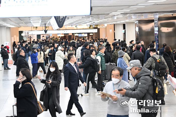 8일 제주국제공항 국내선 도착 대합실이 일찍부터 제주를 찾은 귀성객과 관광객들로 붐비고 있다. 강희만 기자