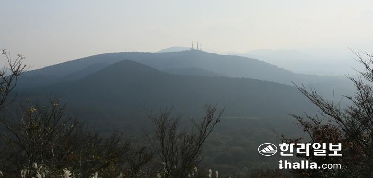 철탑이 있는 봉우리가 개오리오름의 주봉, 정면 봉우리는 족은개오리, 그 사이 샛개오리, 주봉 건너에 물장올이 보인다. 강경민