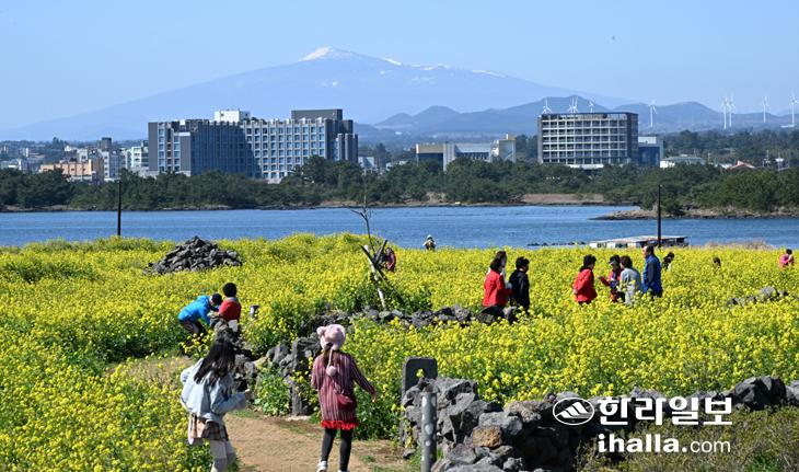 14일 서귀포시 성산읍 성산일출봉 인근 유채밭에서 관광객들이 한라산을 배경으로 사진을 찍고 있다. 강희만기자