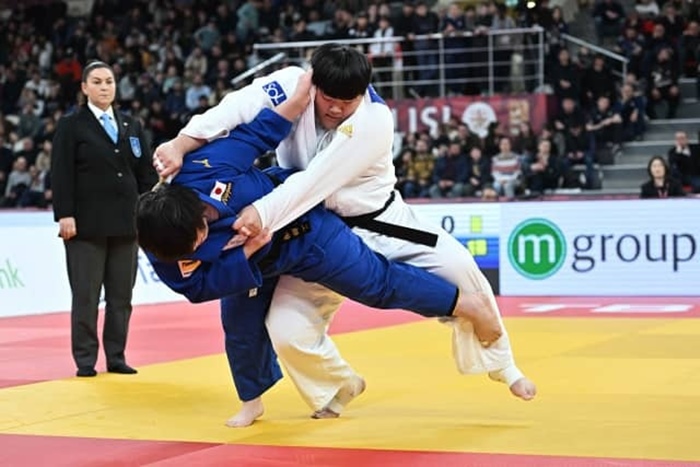 24일(한국시간) 조지아 트빌리시 올림픽스포츠팰리스에서 열린 2024 국제유도연맹(IJF) 트빌리시 그랜드슬램 여자 +78㎏급 동메달 결정전에서 이현지가 도쿄올림픽 금메달리스트인 일본의 소네 아키라와 경기를 펼치고 있다. 국제유도연맹 제공