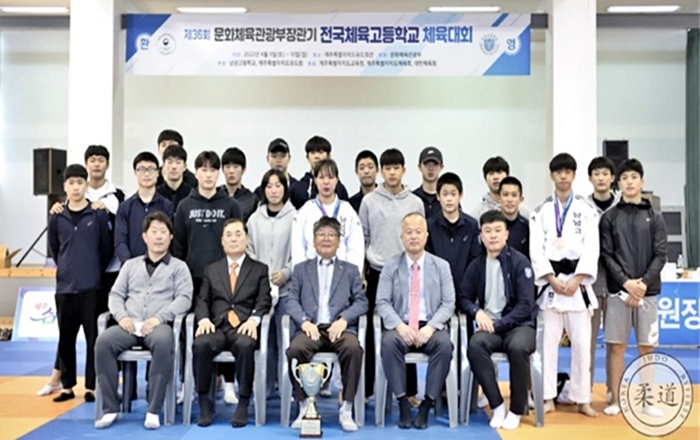 남녕고 유도선수단. 앞줄 왼쪽부터 현후익(남녕고지도자) 안도성(제주유도회부회장)강만순(제주도유도회장) 임병기(남녕고 감독) 김영동(남녕고지도자).