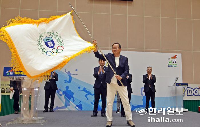 21일 열린 제58회 제주도민체전 폐회식에서 내년 개최지인 제주시 강병삼 시장이 대회기를 넘겨받아 흔들고 있다. 제주자치도체육회 제공