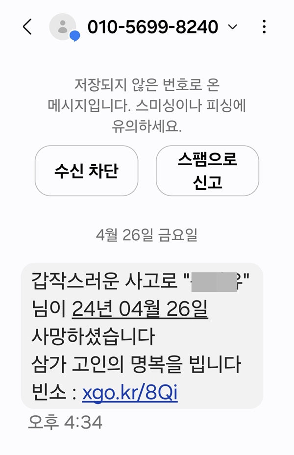 26일 오후 모공공기관의 임원을 사칭해 취재기자에게 발송된 부고장 형태 스미싱 문자.