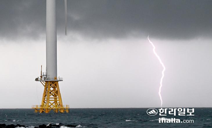 3월 이달의 보도사진상 네이처 부문 최우수로 선정된 한라일보 강희만 기자의 '풍력발전기와 번개'.