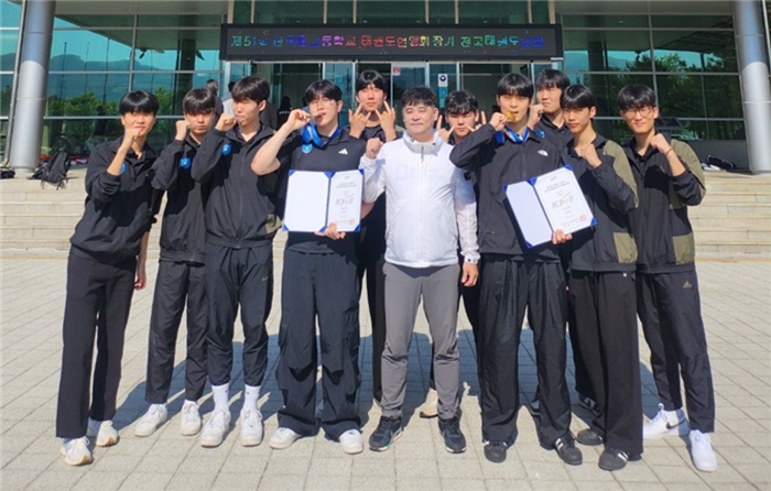 제51회 중고연맹회장기 전국대회에서 전성운과 문민우가 금과 은메달을 따내며 단체종합 3위에 오른 남녕고 선수단.