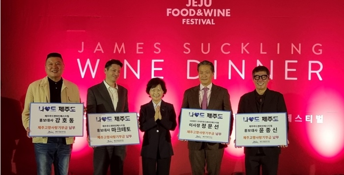 제주특별자치도는 지난 17일 해비치호텔앤드리조트에서 열린 제주미식축제 9일차 행사인 '와인디너'에서 (사)코리아푸드앤와인페스티벌(JFWF) 정문선 이사장과 홍보대사 겸 방송인 강호동, 윤종신, 마크테토가 제주에 고향사랑기부금을 기탁했다고 21일 밝혔다. <사>
