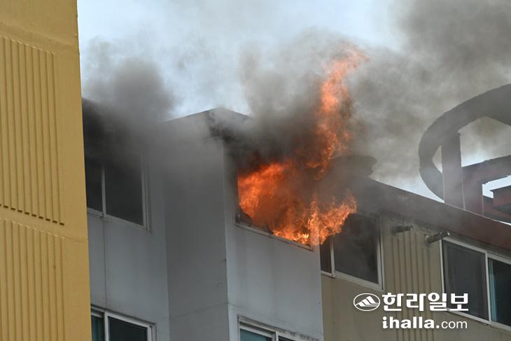30일 제주시 노형동 모 아파트 11층에서 발생한 화재. 강희만 기자