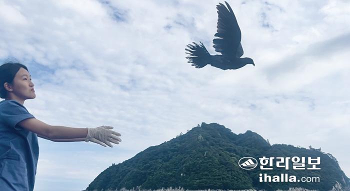 지난달 서귀포시에서 발견된 부상을 입고 발견된 흑비둘기가 치료를 마치고 지난 2일 방사됐다. 제주야생동물구조센터 제공