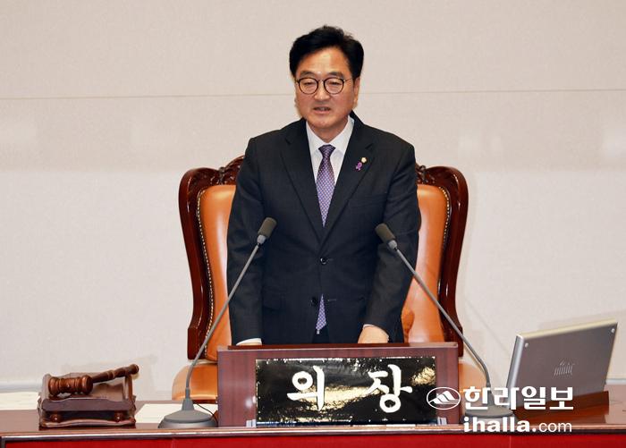 5일 오후 서울 국회에서 열린 제22대 국회 첫 본회의에서 국회의장으로 선출된 우원식 의장이 당선인사를 하고 있다. 연합뉴스