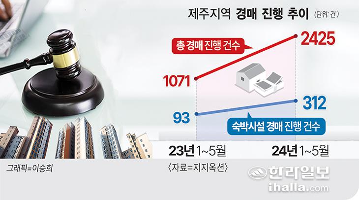 [한라일보] 제주지역 경기 침체로 지난해 하반기부터 증가한 부동산 경매 물건이 올해 들어서도 월평균 500건 안팎에 이를 만큼 급증 추세다. 특히 업무·상업시설 경매 물건의 절반이 숙박시설일 정도로 늘어난 점도 두드러진다.
