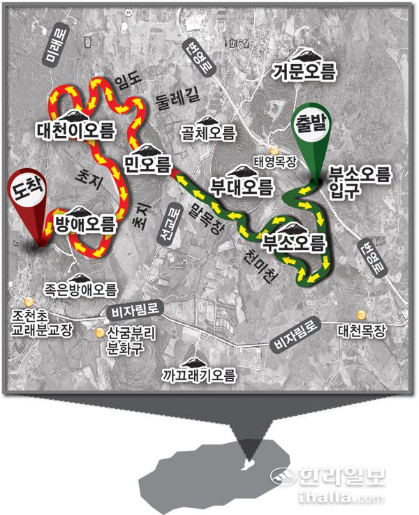 지난 1일 진행된 한라일보의 '2024 제주섬 글로벌 에코투어' 행사는 12.5㎞의 짧지 않은 여정이었다. 부소오름과 민오름 정상, 천미천의 오르막은 힘들었지만 삼나무숲길, 오름둘레길, 초지, 임도 등은 비교적 평탄한 길이었다. 부소, 부대, 민, 대천이, 방애의 5개 오름과 둘레길, 천미천, 목장 등은 제주시 조천읍 선흘리와 교래리에 걸쳐 있으며, 조선시대 목마장 구분으로 2소장과 산마장의 중심지이기도 하다.