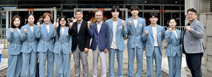 신진성 제주특별자치도체육회장이 지난 9일 서울에서 열린 파리올림픽 결단식에 참가해 제주 연고 선수들을 격려하고 있다. 왼쪽부터 홍영옥, 신유빈, 이은혜, 오예진, 신진성(도체육회장), 오선홍(도체육회 부회장), 이호준, 이주호, 김영택, 엄도현, 장승택(도체육회 선수육성과장). 제주자치도체육회 제공