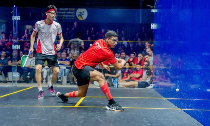 2024 세계주니어선수권대회 단체전 결승전에서 김건이 이집트의 마르완 아살과 경기를 펼치고 있다. 세계스쿼시연맹