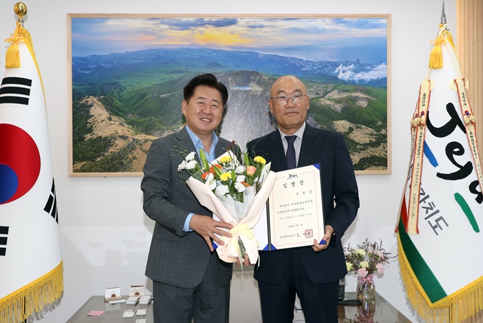 오영훈 제주지사는 31일 오전 집무실에서 진희종 신임 원장에게 임명장을 수여하고 디지털 대전환 시대 도민들을 위한 평생교육에 핵심적인 역할을 해달라고 당부했다.<사진>