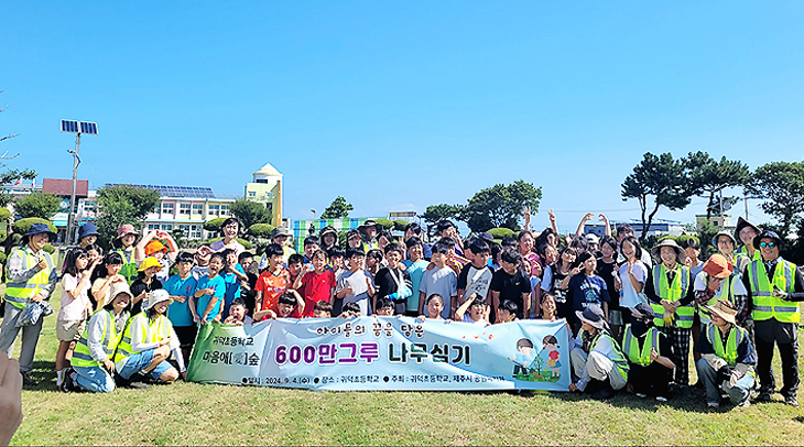 제주시는 지난 4일 귀덕초등학교(교장 문선희) 학생들과 함께 '마음애(愛)숲'으로 이름 붙인 학교숲 조성을 기념해 나무 심기와 개장식을 진행했다. 총사업비 6000만원이 투입된 귀덕초 학교숲에는 이팝나무 등 11종 810그루의 수목 식재와 산책로가 조성됐다. 이날 귀덕초 5, 6학년 학생들은 '탐나는정원' 시민 정원사들과 함께 학교 곳곳에 제주왕벚나무와 목련 등 60여 그루의 나무를 심으며 '600만 그루 나무 심기'에 동참하는 시간도 가졌다.