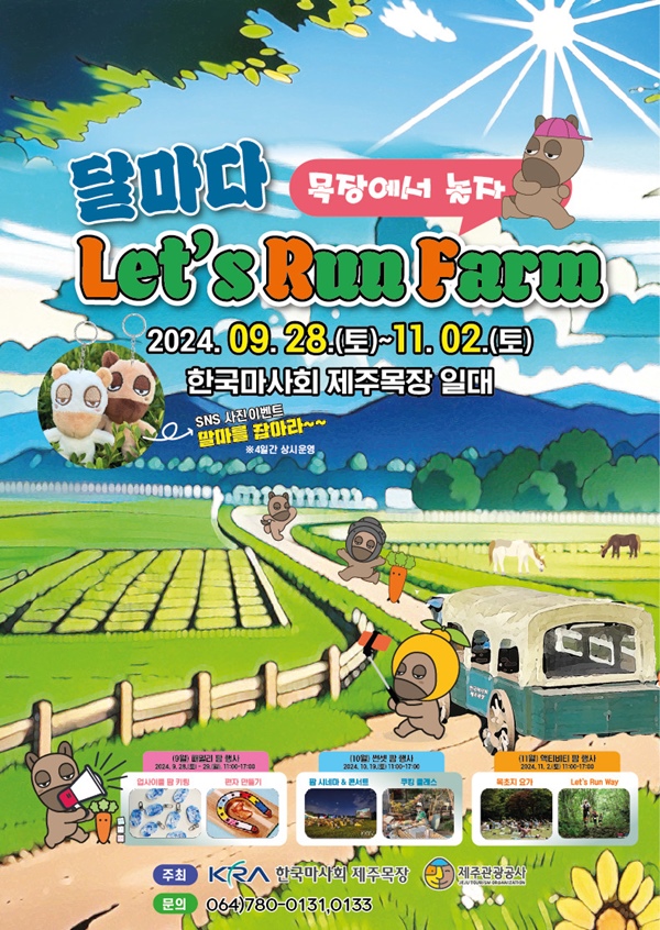[한라일보] 한국마사회 제주목장이 제주관광공사와 함께 11월까지 자연과 가족, 건강을 테마로 '달마다 Let's run Farm, 목장에서 놀자!' 행사를 연다고 23일 밝혔다.