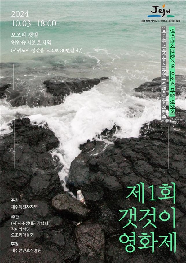 오조리 마을회와 ㈔생태관광협회가 오는 10월 3일 오조리 갯벌 주차장에서 개최하는 '갯것이 영화제'에서는 바다를 배경으로 하거나 주제로 삼은 총 6편의 작품이 상영된다. '갯것이'는 조간대나 바다에서 나는 물건을 뜻하는 제주어로, 이번 영화제를 통해 연안습지의 생태·환경적 가치를 널리 알릴 예정이다.