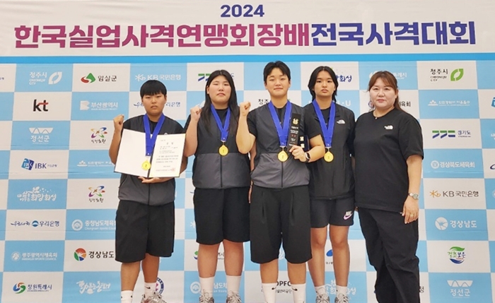2024한국실업연맹회장배 전국사격대회 공기권총 10m에서 여고부 정상에 오른 제주여상팀. 왼쪽부터 양서윤 강서정 강지예 김유나 박미숙코치