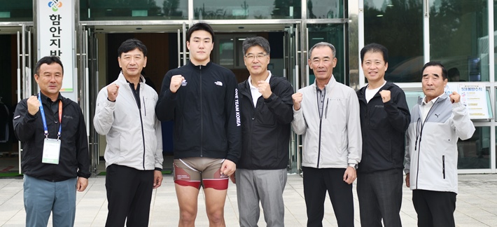 17일 동메달을 따낸 레슬링 이민호 선수(왼쪽에서 세번째)를 격려하는 신진성 제주자치도체육회장(왼쪽에서 네번째).