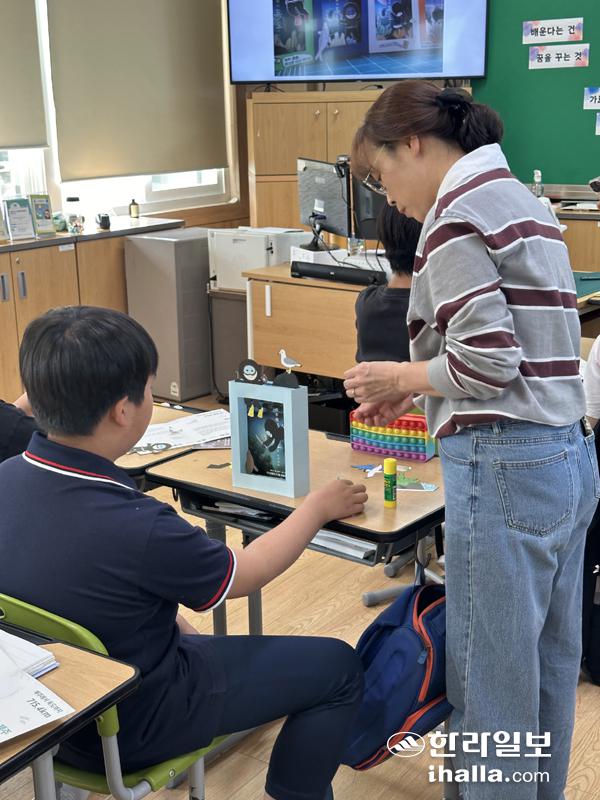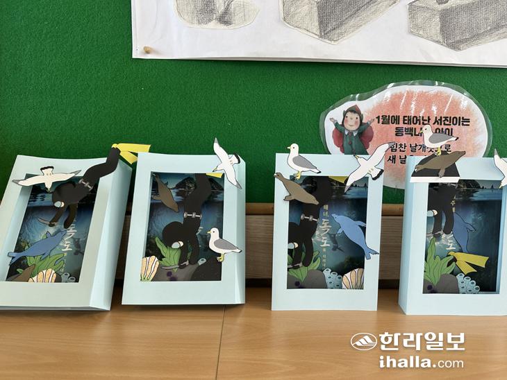 팝업북을 완성한 학생들은 테왁망사리와 오리발을 직접 착용해 보며 신기해했다. 아이들은 서로 장난도 치며 즐겁게 수업이 마무리가 됐다.