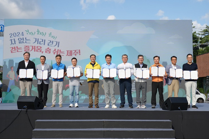지난달 28일 제주시 연북로에서 열린 차 없는 거리 행사 개막식에서 '제주도민 10억 걸음 달성 2억원 걷기기부' 캠페인 협약에 참여한 기업 관계자들이 기념 촬영을 하고 있다.