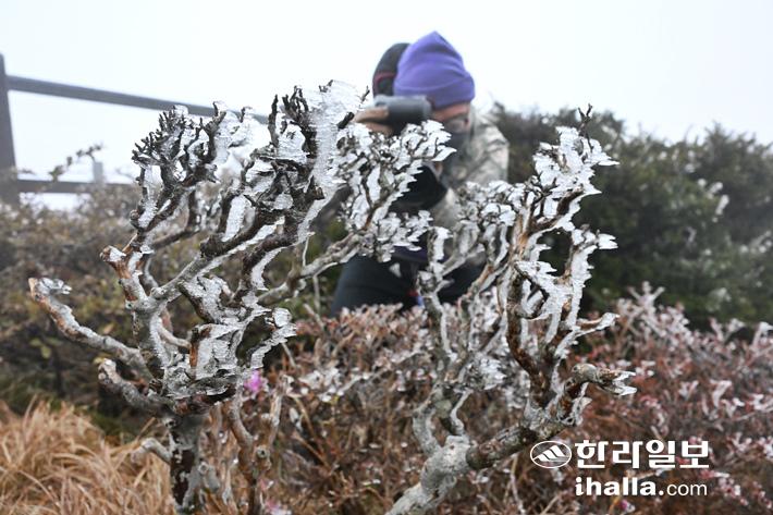찬 공기 영향으로 영하권을 보인 한라산 윗세오름에 올 가을 들어 처음으로 상고대가 활짝 피면서 등반객의 눈길을 사로잡고 있다. 강희만 기자