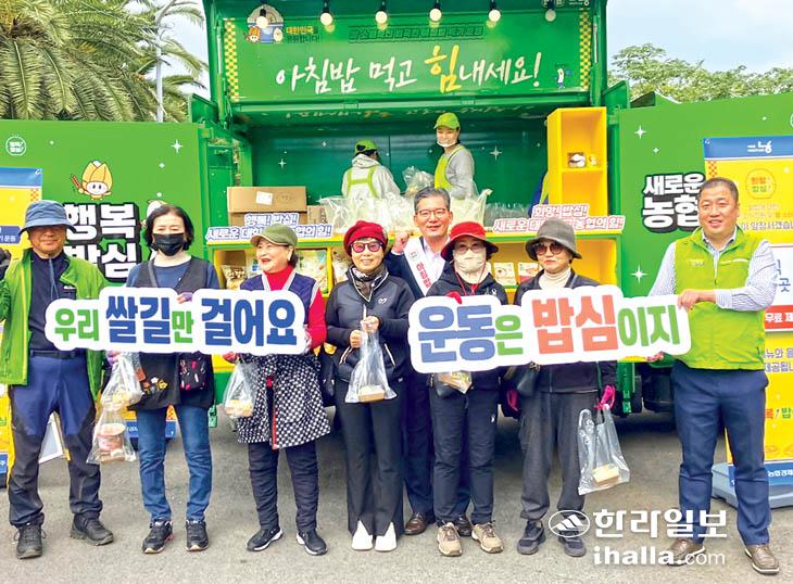 이날 제주농협은 사라봉공원을 찾은 시민 등 300여 명을 대상으로 주먹밥, 덮밥 등 국산 쌀을 활용한 간편식과 식혜를 나눠주고 SNS 인증 이벤트를 진행하는 등 아침밥 먹기 운동 확산 캠페인을 펼치고 시민들의 적극적인 참여를 독려했다.