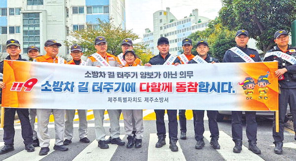 [한라일보] 제주시 화북119센터(센터장 강진)와 화북의용소방대(대장 강재천·남정임)는 20일 화재 발생시 안전하고 신속한 소방차 진입을 위해 화북주공아파트와 화북시장 일대에서 소방차 길터주기 캠페인을 실시했다.