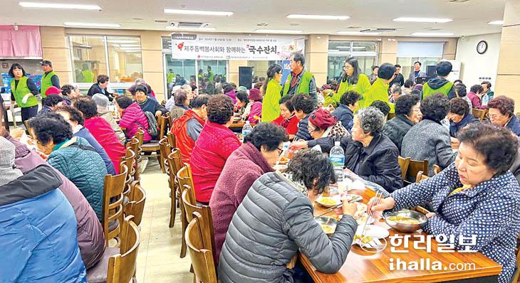 제주영락종합사회복지관(관장 이상언)은 지난 24일 제주특별자치도동백봉사회(회장 김용석)의 후원과 봉사를 통해 지역주민 및 사례관리가정 200여 명을 초대해 국수와 수육 등의 특식을 대접하는 '국수잔치'사업을 실시했다. 이번 행사는 국수 한 그릇에 따듯함을 담아 올해를 훈훈하게 마무리하기 위해 시작됐다.