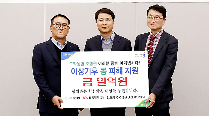 구좌농협(조합장 윤민)은 지난달 26일 서울 광동제약 본사에서 광동제약(회장 최성원), 한국국산콩생산자연합회(회장 조영제)와 함께 이상기후로 인해 작황 부진, 수확량 감소로 어려움을 겪고 있는 콩 재배 농가에 피해지원금 1억원을 지원하기로 했다.