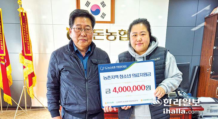 효돈농협(조합장 백성익)은 지난 4일 조합장실에서 한부모 가정 1가구에 농촌지역 어린이와 청소년을 위한 희망이음 의료비 400만원을 전달했다.