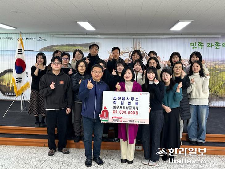 이번 기탁한 성금은 주민참여예산 운영, 광고물 정비 등 각동 시책 평가에서 받은 상금과 직원들의 상조회비를 모아 마련했다. 양정화 조천읍장은 "경기침체로 어려움을 겪고 있는 지역사회에 공직자들의 온정이 전달될 수 있기를 바란다"고 전했다.