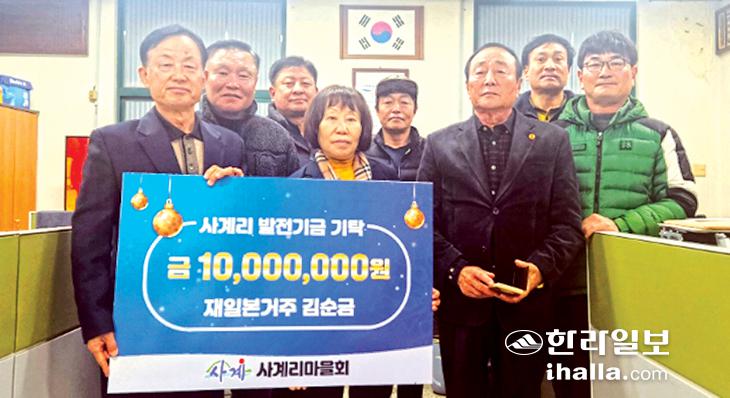 서귀포시 안덕면 사계리 출신으로 일본에 거주하는 김순금씨는 지난 12일 사계리마을회(이장 이경옥)를 찾아 마을발전기금 1000만원을 기탁했다. 이날 전달된 기탁금은 사계리 지역 마을 발전을 위해 쓰일 예정이다.