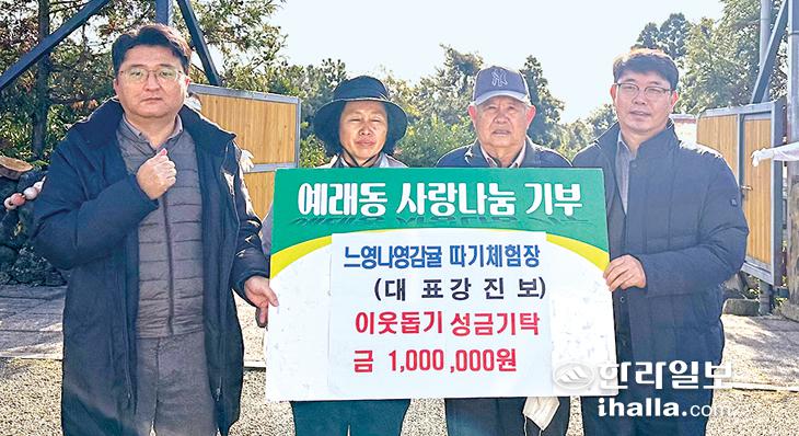 느영나영 감귤따기 체험장(대표 강진보)는 최근 서귀포시 예래동 지역 내 어려운 이웃을 위해 사용해 달라며 성금 100만원을 예래동주민센터(동장 김달은)에 기탁했다.