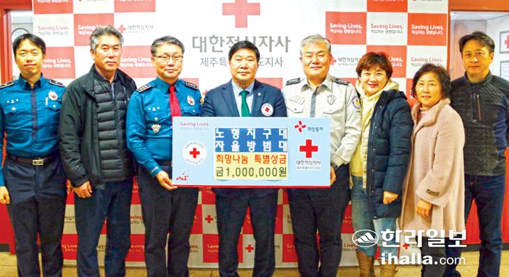 서부경찰서 노형자율방범대(대장 양경택)는 지난 18일 대한적십자사 제주지사를 방문해 희망나눔 특별 성금 100만원과 직접 담근 김장김치를 노형동 솜뽁살레 나눔 냉장고에 기탁했다.