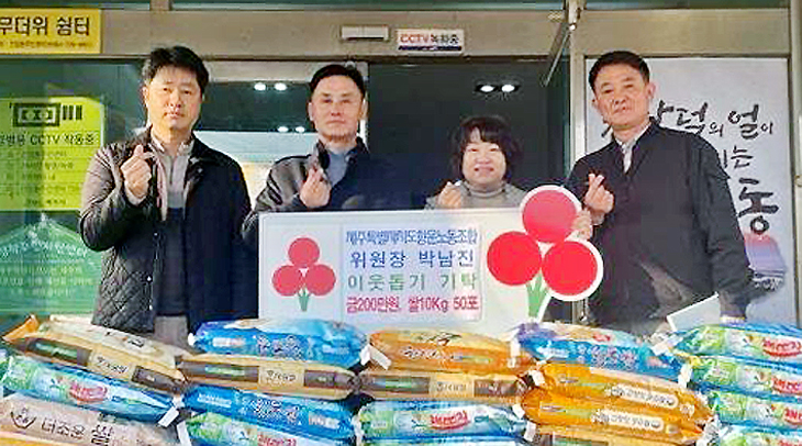 제주특별자치도 항운노동조합(위원장 박남진)은 지난 23일 제주시 건입동(동장 김미성)을 방문해 성금 200만원과 쌀 50포(10㎏)를 기탁했다. 기탁물품은 제45년차 정기대의원대회 당시 화환 대신 쌀을 받아 마련됐다.