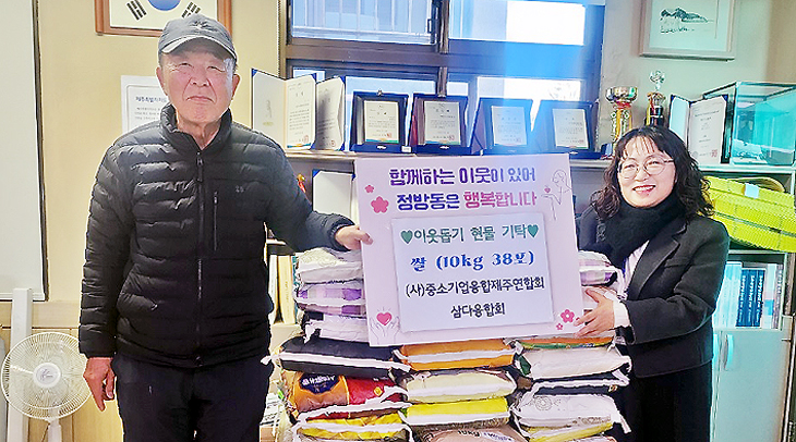 (사)중소기업융합제주연합회 삼다융합회(회장 서삼윤)는 지난 17일 서귀포시 정방동주민센터(동장 김현숙)를 방문해 지역 내 어려운 이웃을 위해 사용해 달라며 쌀 10㎏ 38포를 기탁했다.