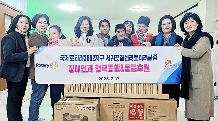 국제로타리3662지구 서귀포칠십리로타리클럽(회장 좌향순)은 지난 17일 지역 내 장애인시설을 찾아 '장애인과 행복동행'을 위한 후원 물품을 전달하고 격려했다.