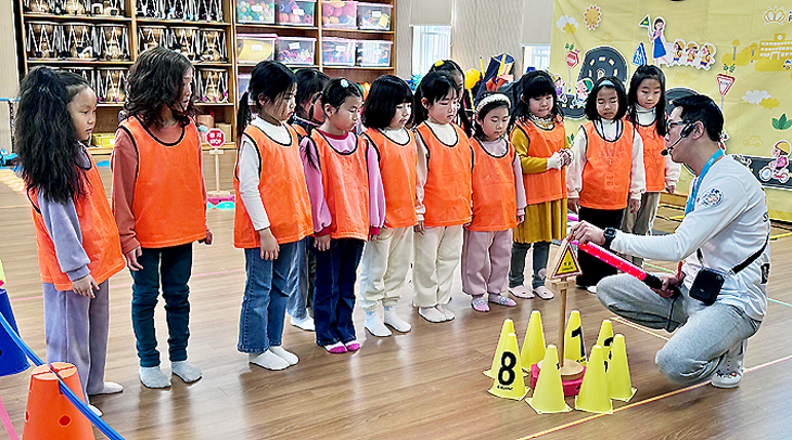 이날 도로교통 안전교육을 시작으로 횡단보도에서 안전하게 걸어가는 법과 교통표지판에 대해 알아보고, 킥보드 면허 필기·실기시험을 체험했다.
