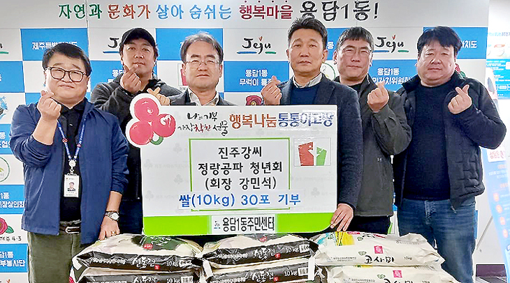 진주강씨 정랑공파 청년회(회장 강민석)는 지난 18일 제주시 용담1동주민센터(동장 강재선)를 방문해 어려운 이웃을 위한 쌀 10㎏ 30포를 전달했다.