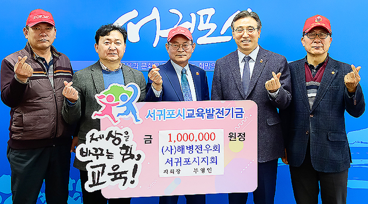 사단법인 해병대전우회 서귀포시지회(지회장 부영인)는 지난 20일 서귀포시청 접견실에서 (재)서귀포시교육발전기금(이사장 김문수)에 100만원을 기탁했다.