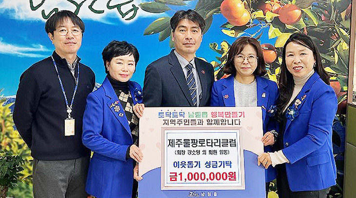 제주물팡로타리클럽(회장 강소영)은 지난 20일 서귀포시 남원읍에 어려운 이웃을 돕는 데 사용해달라며 성금 100만원을 기탁했다. 강소영 회장은 "지속적인 나눔과 봉사로 지역사회를 위해 노력하겠다"고 전했다.